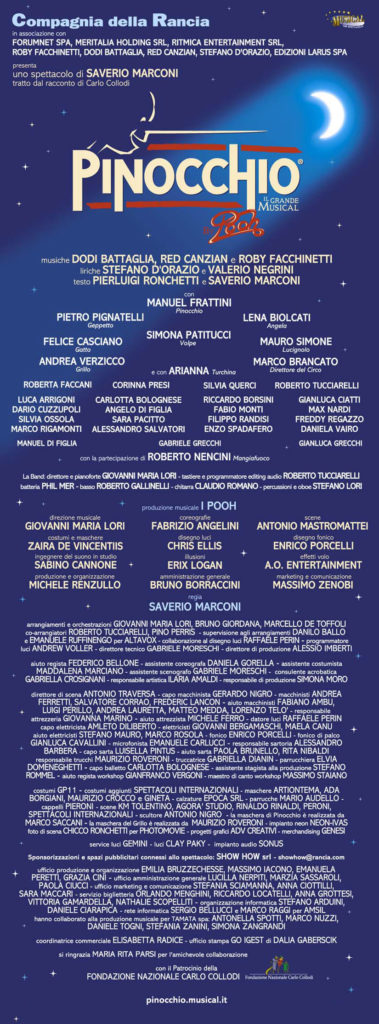 Per la realizzazione di Pinocchio la Compagnia della Rancia si è avvalsa della collaborazione di grandi professionisti: il copione firmato da Pierluigi Ronchetti, gli effetti speciali dell’americano Erix Logan, le scene di Antonio Mastromattei, i costumi di Zaira de Vincentiis, le coreografie di Fabrizio Angelini, la direzione musicale di Giovanni Maria Lori, il disegno luci di Chris Ellis e il disegno tecnico di Enrico Porcelli.